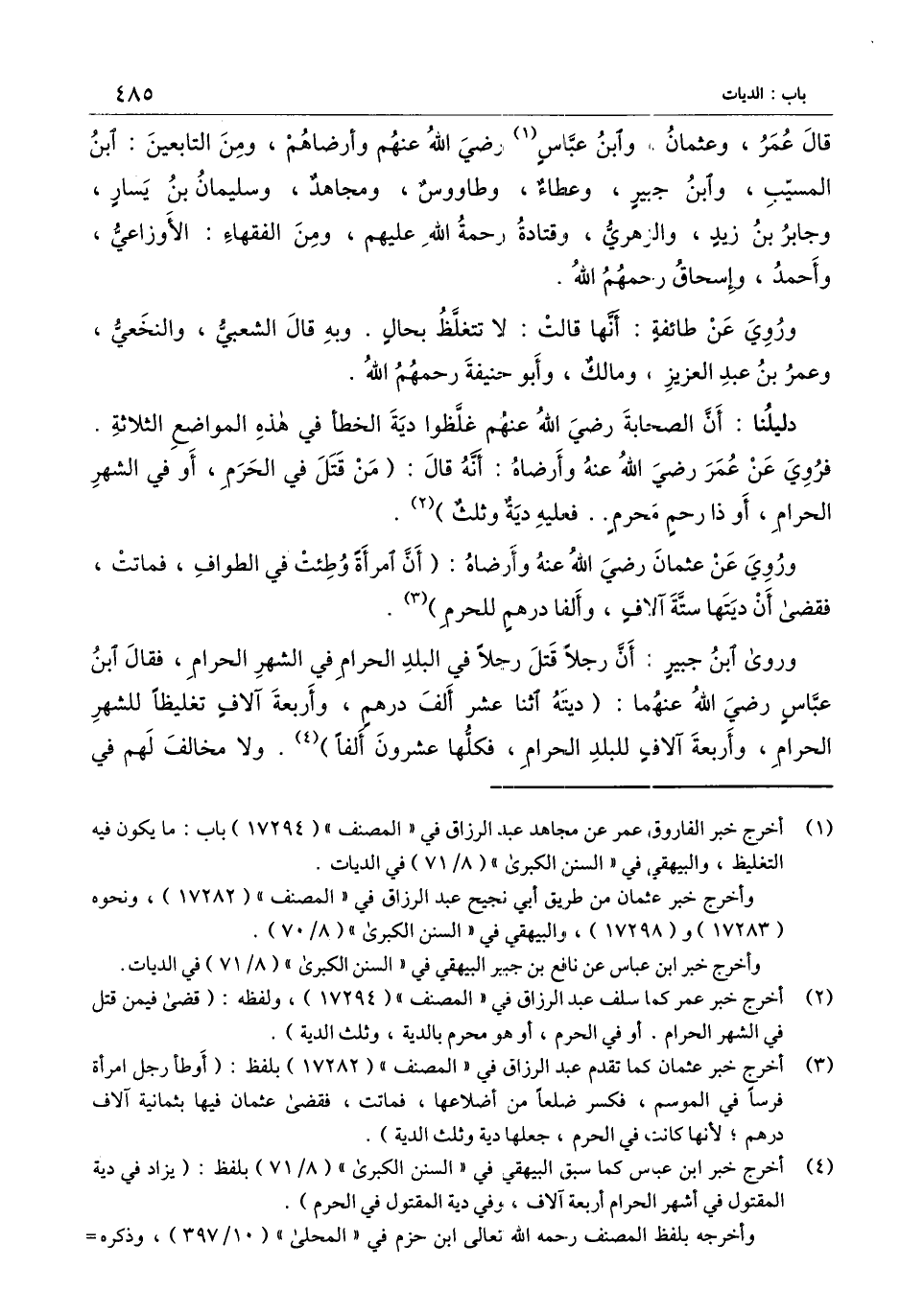 وروى ابن جبير: أن رجلاً قتل رجلاً في البلد الحرام في الشهر الحرام، فقال ابن عباس - رَضِيَ اللَّهُ عَنْهُمَا -: (ديته اثنا عشر ألف درهم، وأربعة آلاف تغليظاً للشهر الحرام، وأربعة آلاف للبلد الحرام، فكلها عشرون ألفاً) . ولا مخالف لهم في