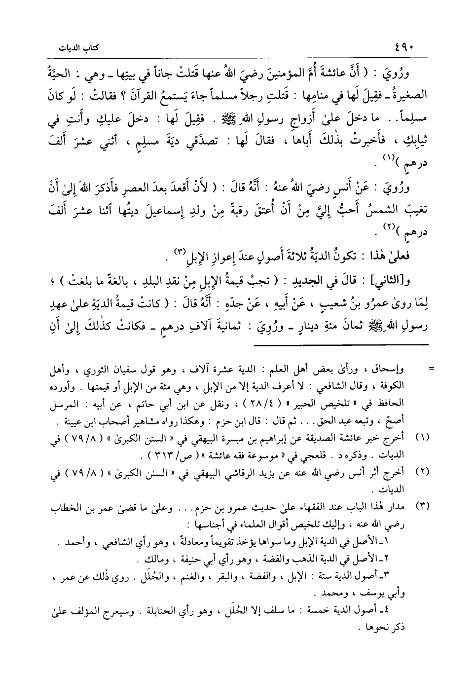 وروي: (أن عائشة أم المؤمنين - رَضِيَ اللَّهُ عَنْهَا - قتلت جاناً في بيتها - وهي: الحية الصغيرة - فقيل لها في منامها: قتلت رجلاً مسلماً جاء يستمع القرآن؟ فقالت: لو كان مسلماً.. ما دخل على أزواج رسول الله - صَلَّى اللَّهُ عَلَيْهِ وَسَلَّمَ -. فقيل لها: دخل عليك وأنت في ثيابك، فأخبرت بذلك أباها، فقال لها: تصدقي دية مسلم، اثني عشر ألف درهم) .
