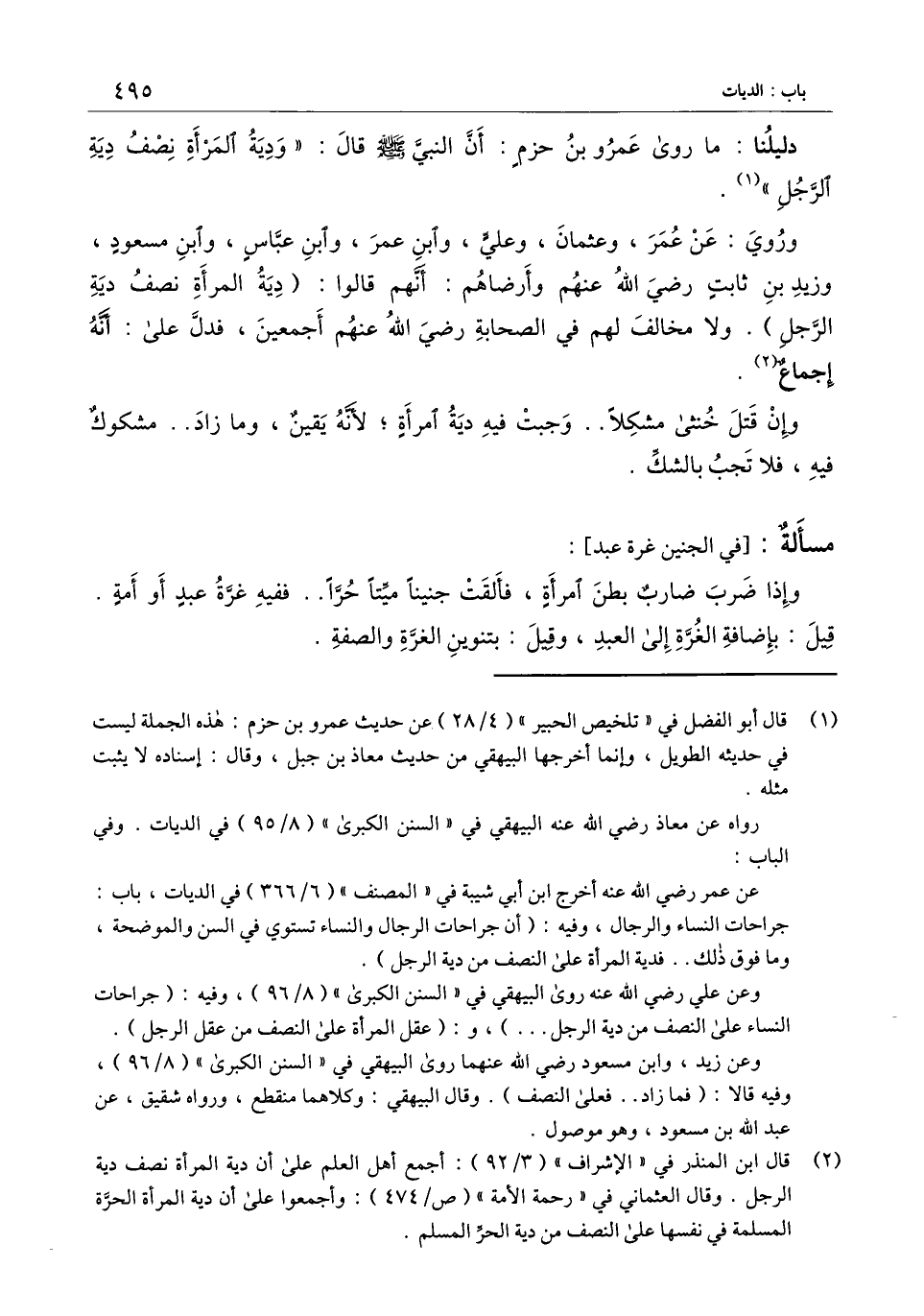 وروي: عن عمر، وعثمان، وعلي، وابن عمر، وابن عباس، وابن مسعود، وزيد بن ثابت - رَضِيَ اللَّهُ عَنْهُمْ - وأرضاهم: أنهم قالوا: (دية المرأة نصف دية الرجل) . ولا مخالف لهم في الصحابة - رَضِيَ اللَّهُ عَنْهُمْ أَجْمَعِينَ -، فدل على: أنه إجماع.