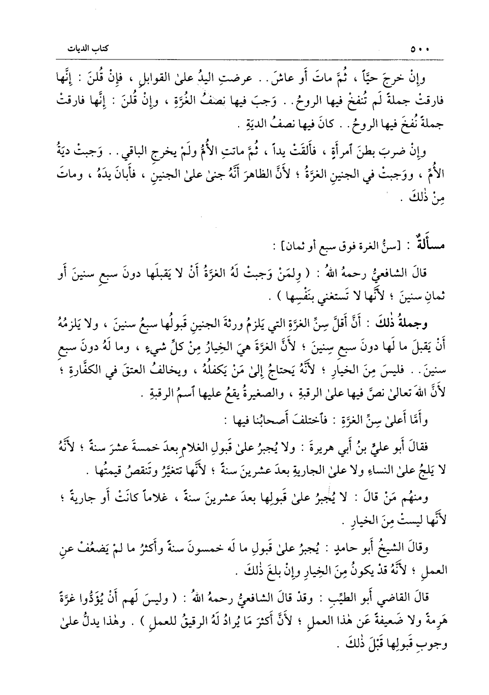 وجملة ذلك: أن أقل سن الغرة التي يلزم ورثة الجنين قبولها سبع سنين، ولا يلزمه أن يقبل ما لها دون سبع سنين؛ لأن الغرة هي الخيار من كل شيء، وما له دون سبع سنين.. فليس من الخيار؛ لأنه يحتاج إلى من يكفله، ويخالف العتق في الكفارة؛ لأن الله تعالى نص فيها على الرقبة، والصغيرة يقع عليها اسم الرقبة.