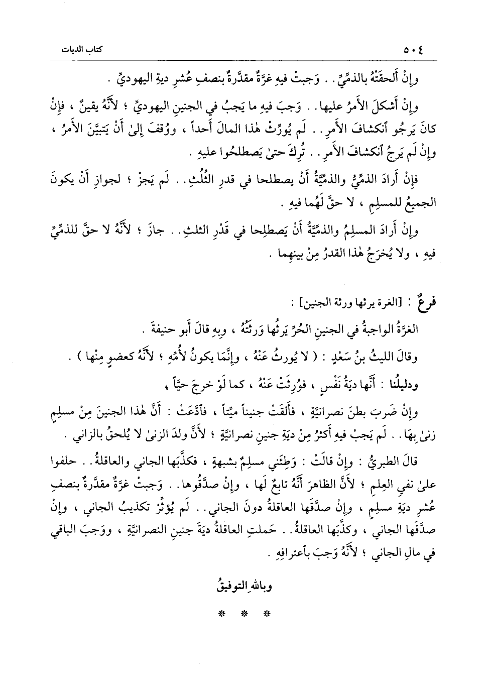 قال الطبري: وإن قالت: وطئني مسلم بشبهة، فكذبها الجاني والعاقلة.. حلفوا على نفي العلم؛ لأن الظاهر أنه تابع لها، وإن صدقوها.. وجبت غرة مقدرة بنصف عشر دية مسلم، وإن صدقها العاقلة دون الجاني.. لم يؤثر تكذيب الجاني، وإن صدقها الجاني وكذبها العاقلة.. حملت العاقلة دية جنين النصرانية، ووجب الباقي في مال الجاني؛ لأنه وجب باعترافه.