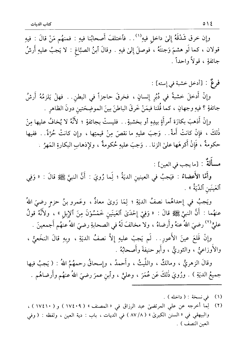 ] : وأما الأعضاء: فيجب في العينين الدية؛ لما روي: أن النبي - صَلَّى اللَّهُ عَلَيْهِ وَسَلَّمَ - قال: «وفي العينين الدية» .