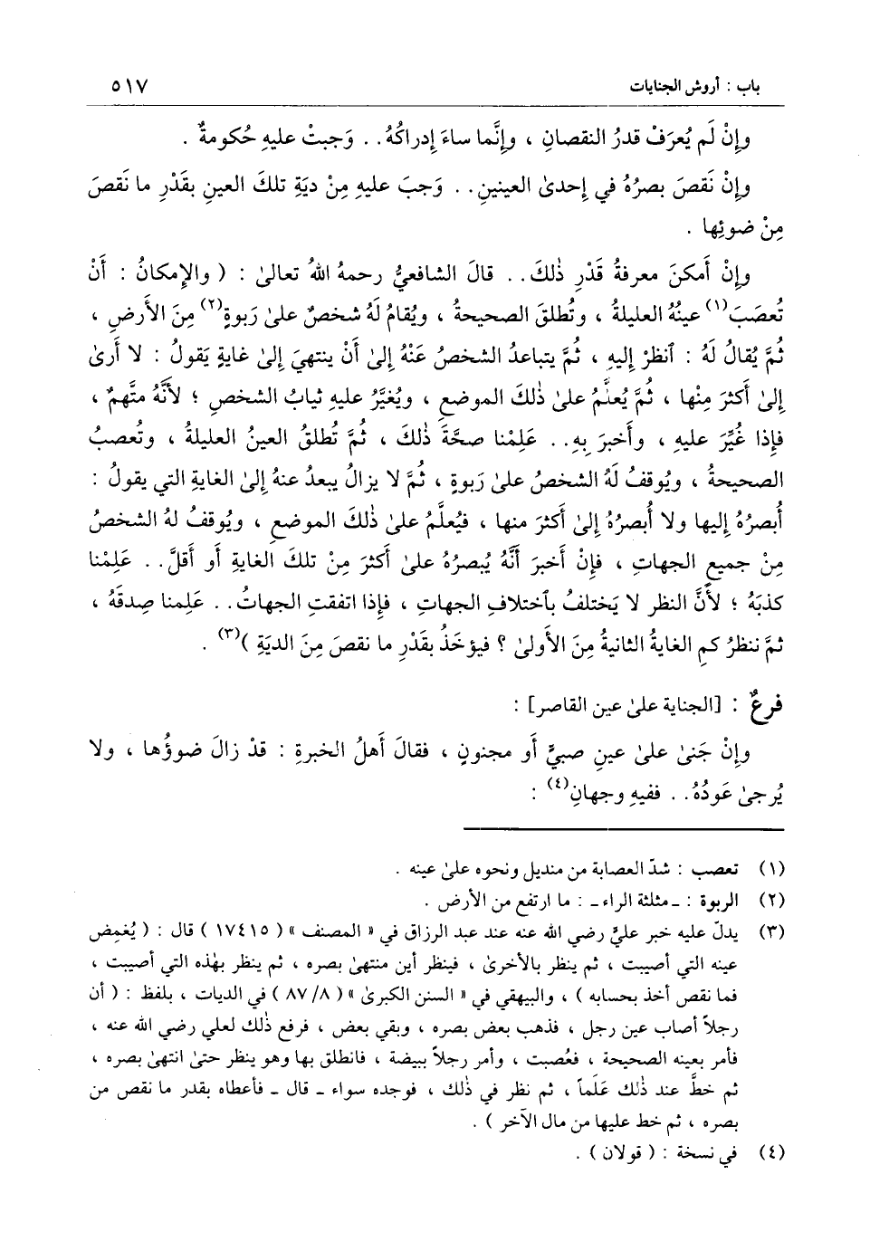 وإن أمكن معرفة قدر ذلك.. قال الشافعي - رَحِمَهُ اللَّهُ تَعَالَى -: (والإمكان: أن تعصب عينه العليلة، وتطلق الصحيحة، ويقام له شخص على ربوة من الأرض، ثم يقال له: انظر إليه، ثم يتباعد الشخص عنه إلى أن ينتهي إلى غاية يقول: لا أرى إلى أكثر منها، ثم يعلم على ذلك الموضع، ويغير عليه ثياب الشخص؛ لأنه متهم، فإذا غير عليه، وأخبر به.. علمنا صحة ذلك، ثم تطلق العين العليلة، وتعصب الصحيحة، ويوقف له الشخص على ربوة، ثم لا يزال يبعد عنه إلى الغاية التي يقول: أبصره إليها ولا أبصره إلى أكثر منها، فيعلم على ذلك الموضع، ويوقف له الشخص من جميع الجهات، فإن أخبر أنه يبصره على أكثر من تلك الغاية أو أقل.. علمنا كذبه؛ لأن النظر لا يختلف باختلاف الجهات، فإذا اتفقت الجهات.. علمنا صدقه، ثم ننظر كم الغاية الثانية من الأولى؟ فيؤخذ بقدر ما نقص من الدية) .