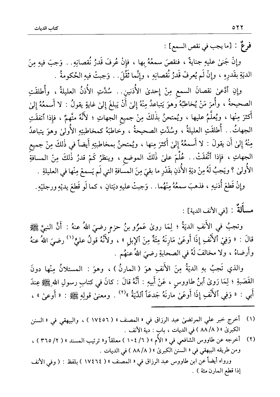 ] : وتجب في الأنف الدية؛ لما روى عمرو بن حزم - رَضِيَ اللَّهُ عَنْهُ -: أن النبي - صَلَّى اللَّهُ عَلَيْهِ وَسَلَّمَ - قال: «وفي الأنف إذا أوعى مارنه مائة من الإبل» ، ولأنه قول علي - رَضِيَ اللَّهُ عَنْهُ - وأرضاه، ولا مخالف له في الصحابة - رَضِيَ اللَّهُ عَنْهُمْ -.