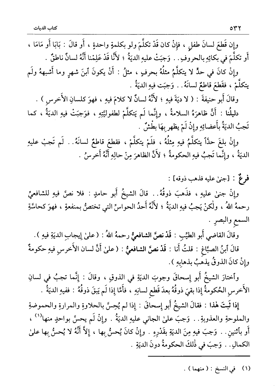 واختار الشيخ أبو إسحاق وجوب الدية في الذوق، وقال: إنما تجب في لسان الأخرس الحكومة إذا بقي ذوقه بعد قطع لسانه، فأما إذا لم يبق ذوقه: ففيه الدية.