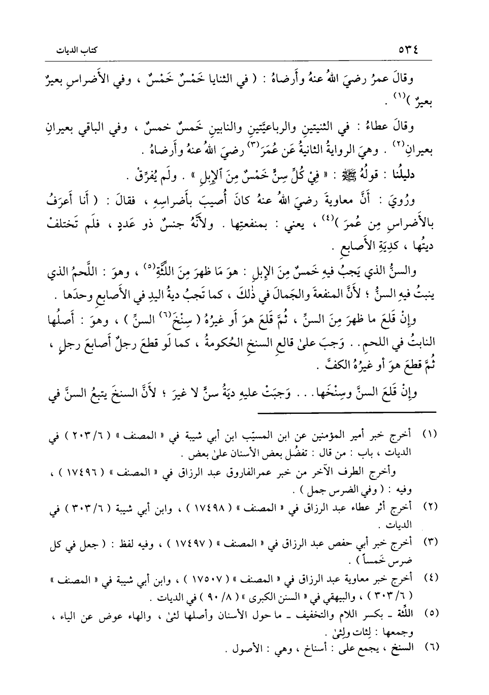 وقال عمر - رَضِيَ اللَّهُ عَنْهُ - وأرضاه: (في الثنايا خمس خمس، وفي الأضراس بعير بعير) .