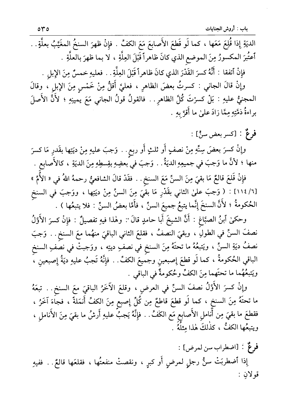 الدية إذا قلع معها، كما لو قطع الأصابع مع الكف. فإن ظهر السنخ المغيب بعلة.. اعتبر المكسور من الموضع الذي كان ظاهرًا قبل العلة، لا بما ظهر بالعلة.