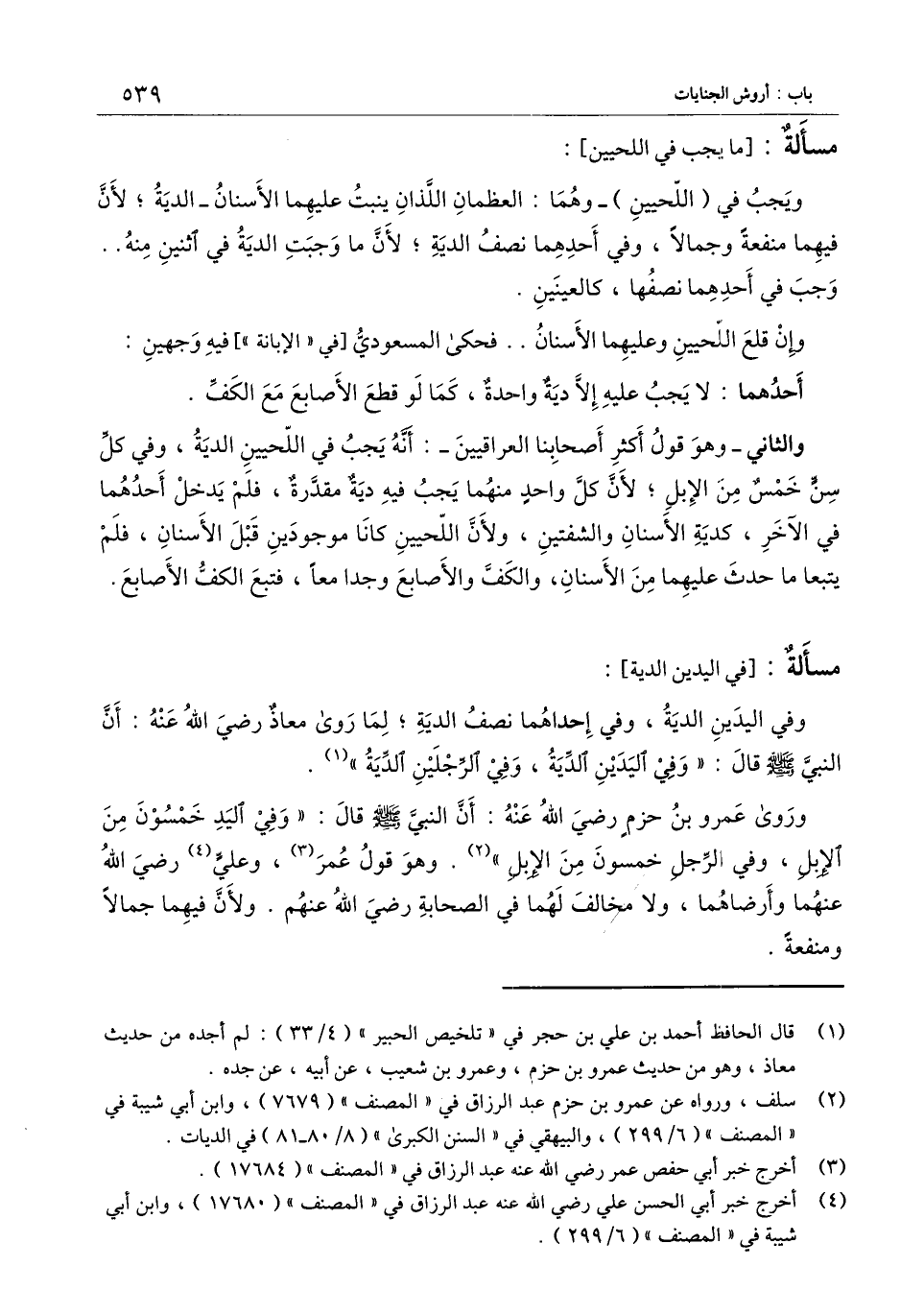 وروى عمرو بن حزم - رَضِيَ اللَّهُ عَنْهُ -: أن النبي - صَلَّى اللَّهُ عَلَيْهِ وَسَلَّمَ - قال: «وفي اليد خمسون من الإبل، وفي الرجل خمسون من الإبل» . وهو قول عمر، وعلي - رَضِيَ اللَّهُ عَنْهُمَا - وأرضاهما، ولا مخالف لهما في الصحابة - رَضِيَ اللَّهُ عَنْهُمْ -. ولأن فيهما جمالًا ومنفعة.