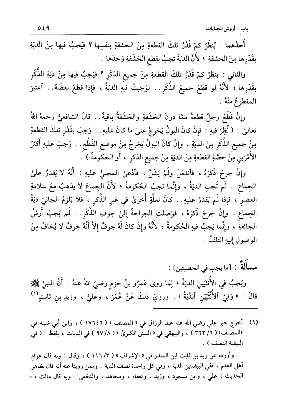 ] : ويجب في الأنثيين الدية؛ لما روى عمرو بن حزم - رَضِيَ اللَّهُ عَنْهُ -: أن النبي - صَلَّى اللَّهُ عَلَيْهِ وَسَلَّمَ - قال: «وفي الأنثيين الدية» . وروي ذلك عن عمر، وعلي، وزيد بن ثابت