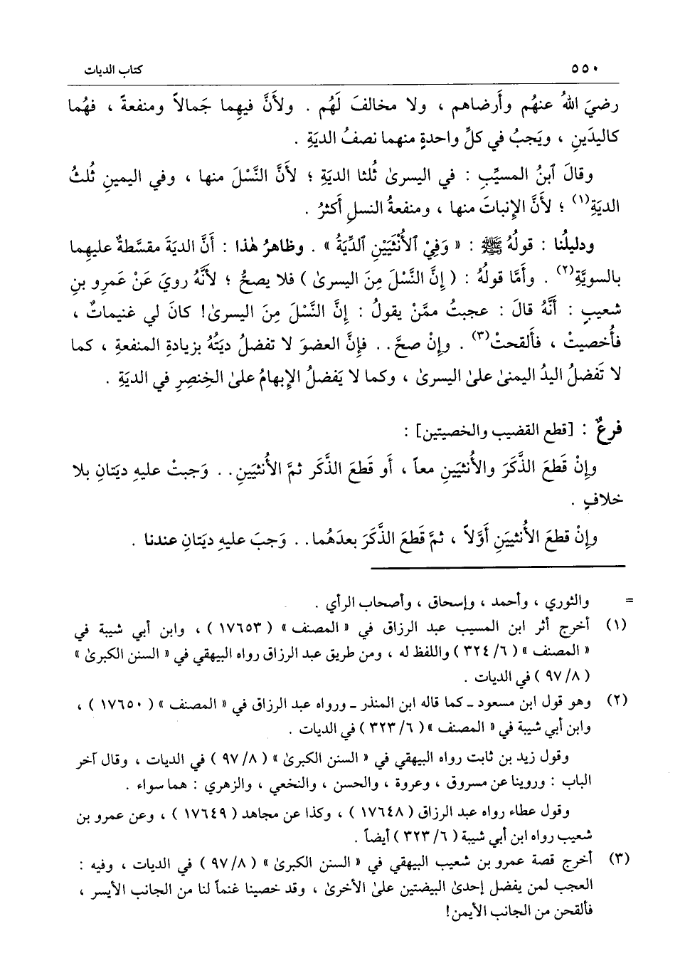 ودليلنا: قوله - صَلَّى اللَّهُ عَلَيْهِ وَسَلَّمَ -: «وفي الأنثيين الدية» . وظاهر هذا: أن الدية مقسطة عليهما بالسوية. وأما قوله: (إن النسل من اليسرى) فلا يصح؛ لأنه روي عن عمرو بن شعيب: أنه قال: عجبت ممن يقول: إن النسل من اليسرى! كان لي غنيمات، فأخصيت، فألقحت. وإن صح.. فإن العضو لا تفضل ديته بزيادة المنفعة، كما لا تفضل اليد اليمنى على اليسرى، وكما لا يفضل الإبهام على الخنصر في الدية.