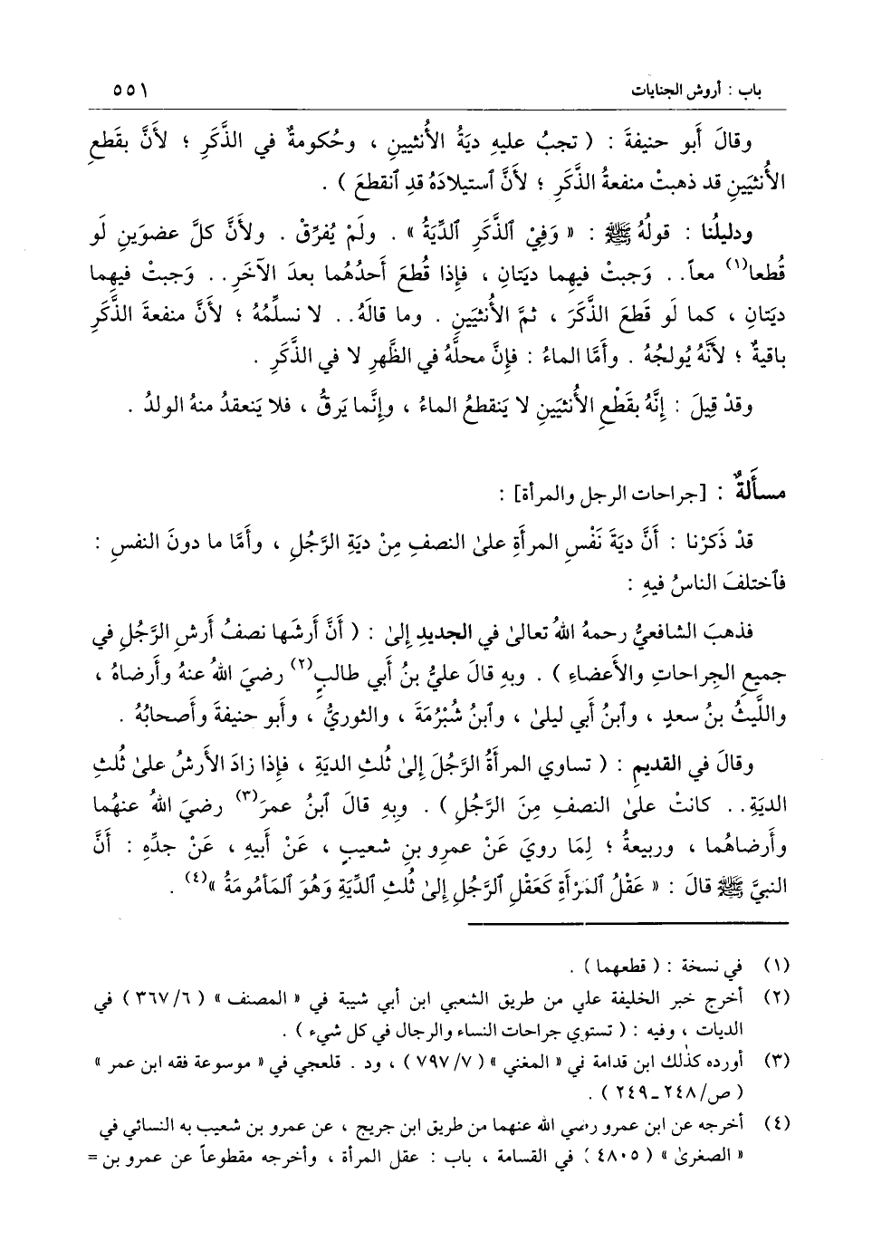فذهب الشافعي - رَحِمَهُ اللَّهُ تَعَالَى - في الجديد إلى: (أن أرشها نصف أرش الرجل في جميع الجراحات والأعضاء) . وبه قال علي بن أبي طالب - رَضِيَ اللَّهُ عَنْهُ - وأرضاه، والليث بن سعد، وابن أبي ليلى، وابن شبرمة، والثوري، وأبو حنيفة وأصحابه.