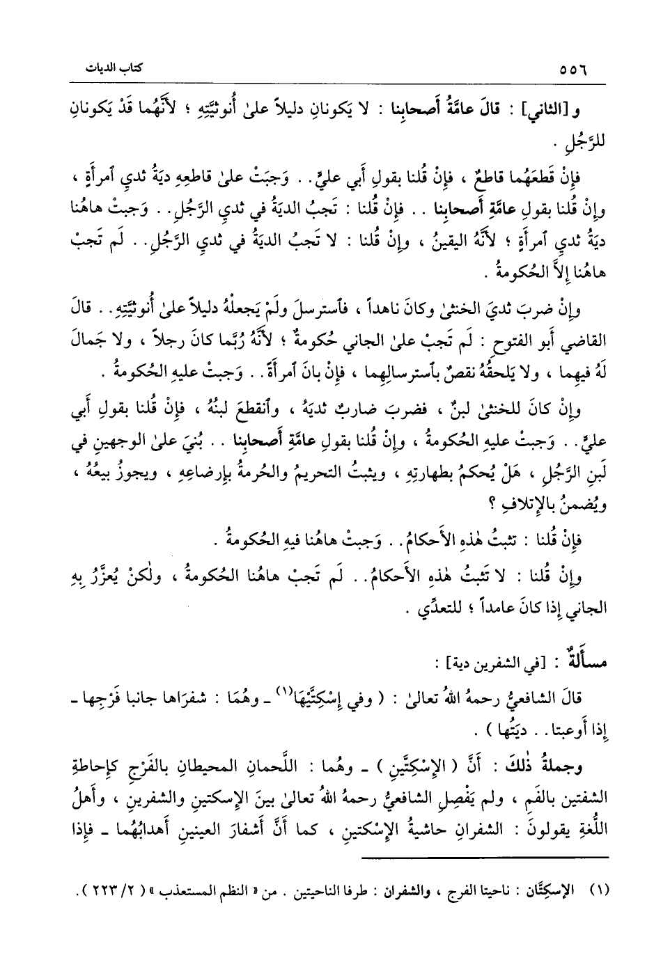 ] : قال الشافعي - رَحِمَهُ اللَّهُ تَعَالَى -: (وفي إسكتيها - وهما: شفراها جانبا فرجها - إذا أوعبتا.. ديتها) .