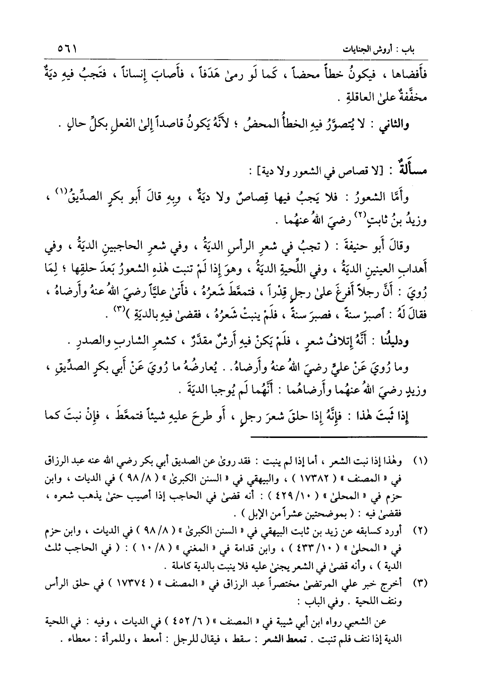 ] : وأما الشعور: فلا يجب فيه قصاص ولا دية، وبه قال أبو بكر الصديق، وزيد بن ثابت - رَضِيَ اللَّهُ عَنْهُمَا -.