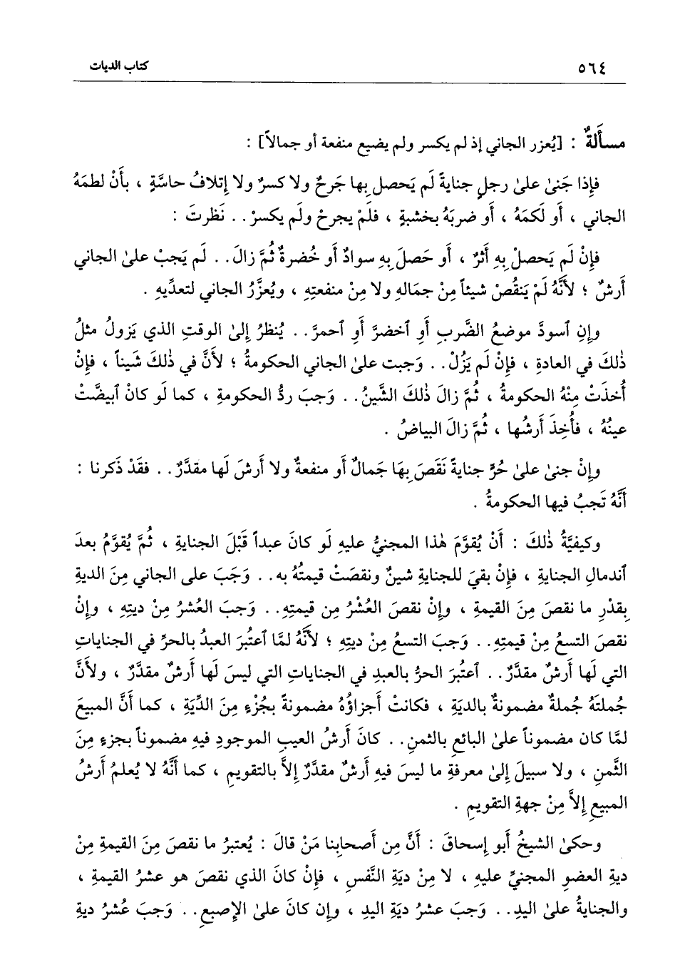 وإن جنى على حر جناية نقص بها جمال أو منفعة ولا أرش لها مقدر.. فقد ذكرنا: أنه تجب فيها الحكومة.