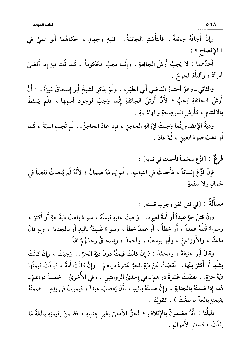 وقال أبو حنيفة، ومحمد: (إن كانت قيمته دون دية الحر.. وجبت، وإن كانت مثلها أو أكثر منها.. نقصت عن دية الحر عشرة دراهم. وإن كانت أمة، فبلغت قيمتها دية حرة.. نقصت عشرة دراهم - في إحدى الروايتين، وفي الأخرى: خمسة دراهم - هذا إذا ضمنه بالجناية، وإن ضمنه باليد، بأن يغصب عبدًا، فيموت في يده.. ضمنه بقيمته بالغة ما بلغت) . كقولنا.