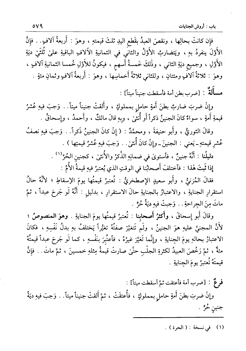 وقال الثوري، وأبو حنيفة، ومحمد: (إن كان الجنين ذكرًا.. وجب فيه نصف عشر قيمته - يعني: الجنين - وإن كان أنثى.. وجب فيه عشر قيمتها) .