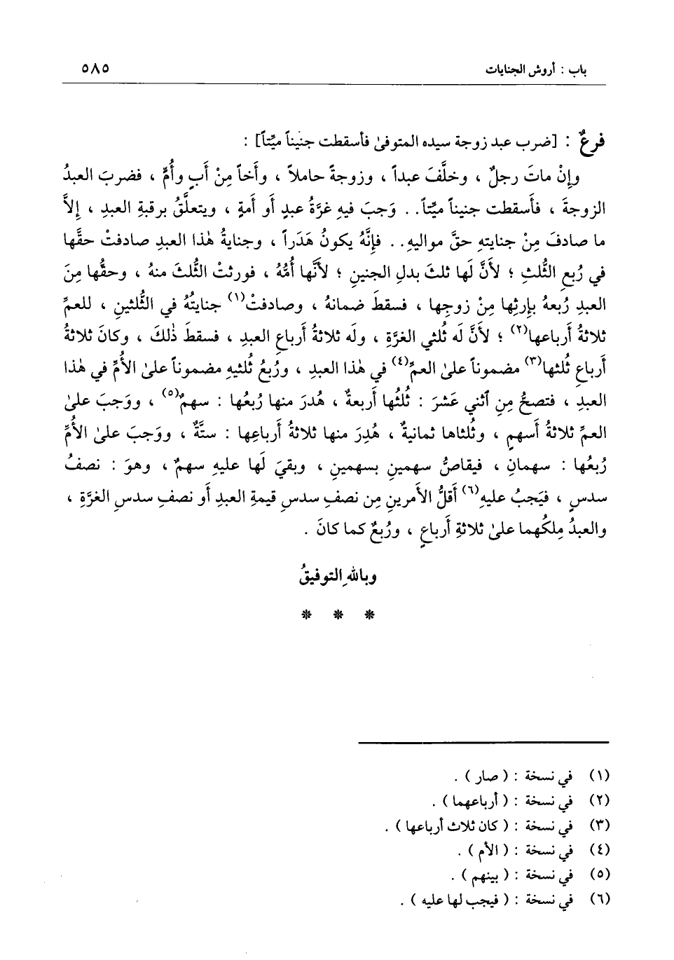 ] : وإن مات رجل، وخلف عبدًا، وزوجة حاملًا، وأخا من أب وأم، فضرب العبد الزوجة، فأسقطت جنينًا ميتًا.. وجب فيه غرة عبد أو أمة، ويتعلق برقبة العبد، إلا ما صادف من جنايته حق مواليه.. فإنه يكون هدرًا، وجناية هذا العبد صادفت حقها في ربع الثلث؛ لأن لها ثلث بدل الجنين؛ لأنها أمه، فورثت الثلث منه، وحقها من العبد ربعه بإرثها من زوجها، فسقط ضمانه، وصادفت جنايته في الثلثين، للعم ثلاثة أرباعها؛ لأن له ثلثي الغرة، وله ثلاثة أرباع العبد، فسقط ذلك، وكان ثلاثة أرباع ثلثها مضمونًا على العم في هذا العبد، وربع ثلثيه مضمونًا على الأم في هذا العبد، فتصح من اثني عشر: ثلثها أربعة، هدر منها ربعها: سهم، ووجب على العم ثلاثة أسهم، وثلثاها ثمانية، هدر منها ثلاثة أرباعها: ستة، ووجب على الأم ربعها: سهمان، فيقاص سهمين بسهمين، وبقي لها عليه سهم، وهو: نصف سدس، فيجب عليه أقل الأمرين من نصف سدس قيمة العبد أو نصف سدس الغرة، والعبد ملكهما على ثلاثة أرباع، وربع كما كان.