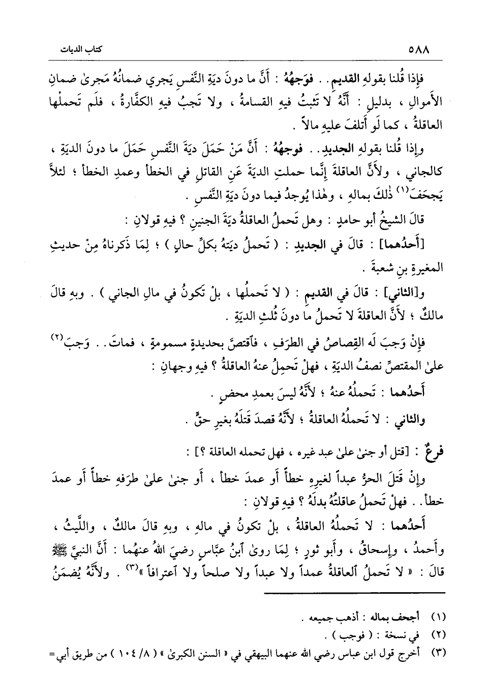 ؟] : وإن قتل الحر عبدًا لغيره خطأ أو عمد خطأ، أو جنى على طرفه خطأ أو عمد خطأ.. فهل تحمل عاقلته بدله؟ فيه قولان: