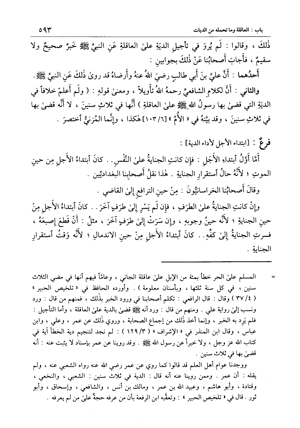 والثاني: أن لكلام الشافعي - رَحِمَهُ اللَّهُ - تأويلًا، ومعنى قوله: (ولم أعلم خلافًا في الدية التي قضى بها رسول الله - صَلَّى اللَّهُ عَلَيْهِ وَسَلَّمَ - على العاقلة) أنها في ثلاث سنين، لا أنه قضى بها في ثلاث سنين، وقد بينه في " الأم " [6/103] هكذا، وإنما المزني اختصر.