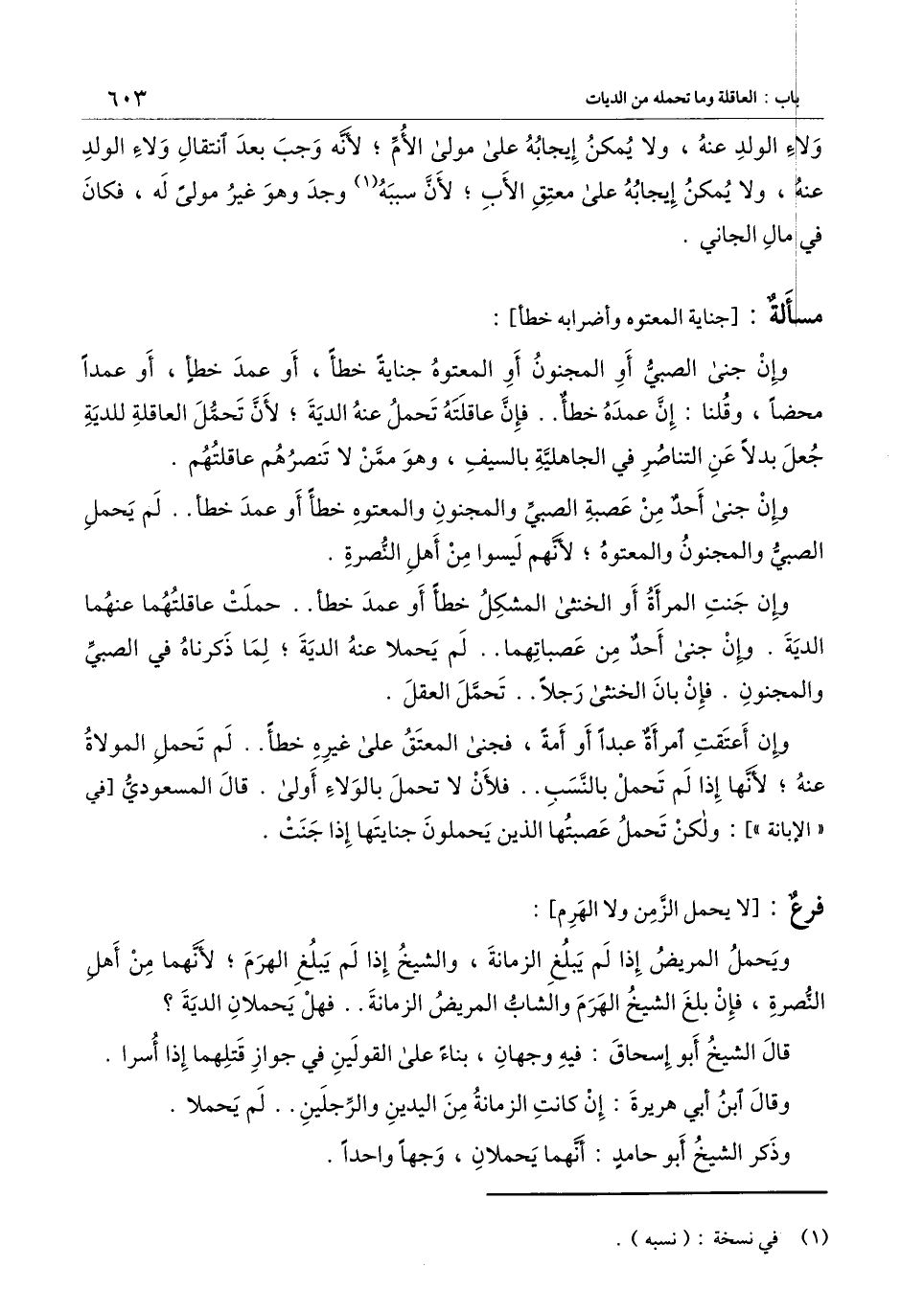 ] : وإن جنى الصبي أو المجنون أو المعتوه جناية خطأ، أو عمد خطأ، أو عمدًا محضًا، وقلنا: إن عمده خطأ.. فإن عاقلته تحمل عنه الدية؛ لأن تحمل العاقلة للدية جعل بدلًا عن التناصر في الجاهلية بالسيف، وهو ممن لا تنصرهم عاقلتهم.