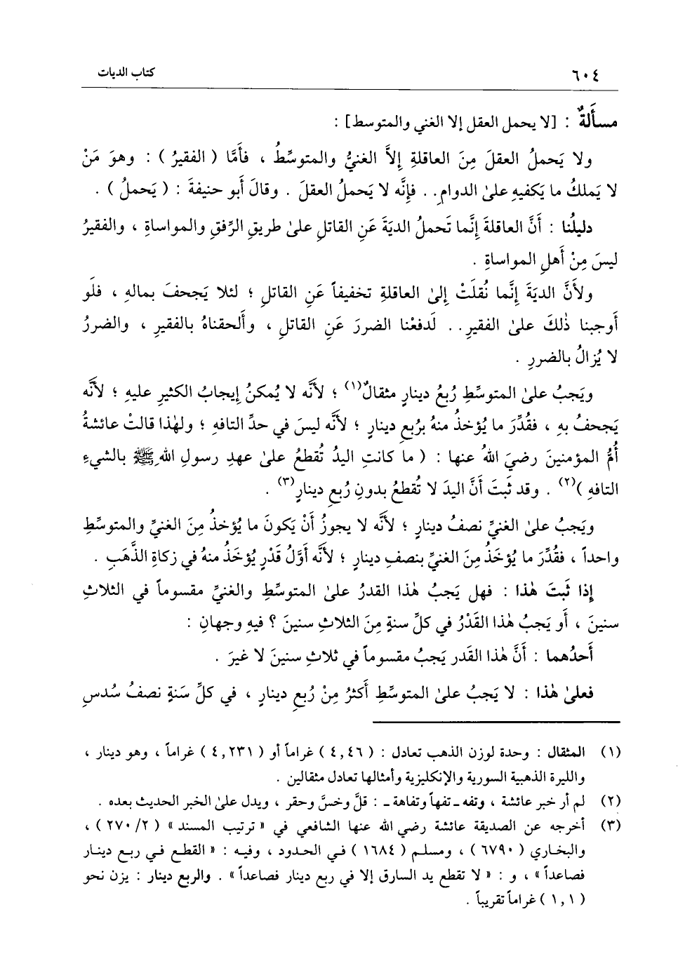 ويجب على المتوسط ربع دينار مثقال؛ لأنه لا يمكن إيجاب الكثير عليه؛ لأنه يجحف به، فقدر ما يؤخذ منه بربع دينار؛ لأنه ليس في حد التافه؛ ولهذا قالت عائشة أم المؤمنين - رَضِيَ اللَّهُ عَنْهَا -: (ما كانت اليد تقطع على عهد رسول الله - صَلَّى اللَّهُ عَلَيْهِ وَسَلَّمَ - بالشيء التافه) . وقد ثبت أن اليد لا تقطع بدون ربع دينار.