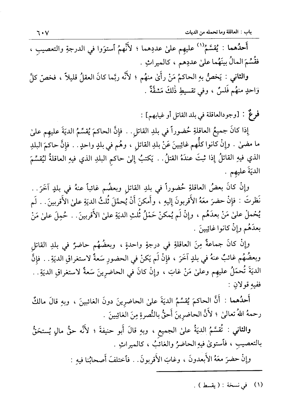 ] : إذا كان جميع العاقلة حضورًا في بلد القاتل.. فإن الحاكم يقسم الدية عليهم على ما مضى. وإن كانوا كلهم غائبين عن بلد القاتل، وهم في بلد واحد.. فإن حاكم البلد الذي فيه القاتل إذا ثبت عنده القتل.. يكتب إلى حاكم البلد الذي فيه العاقلة ليقسم الدية عليهم.