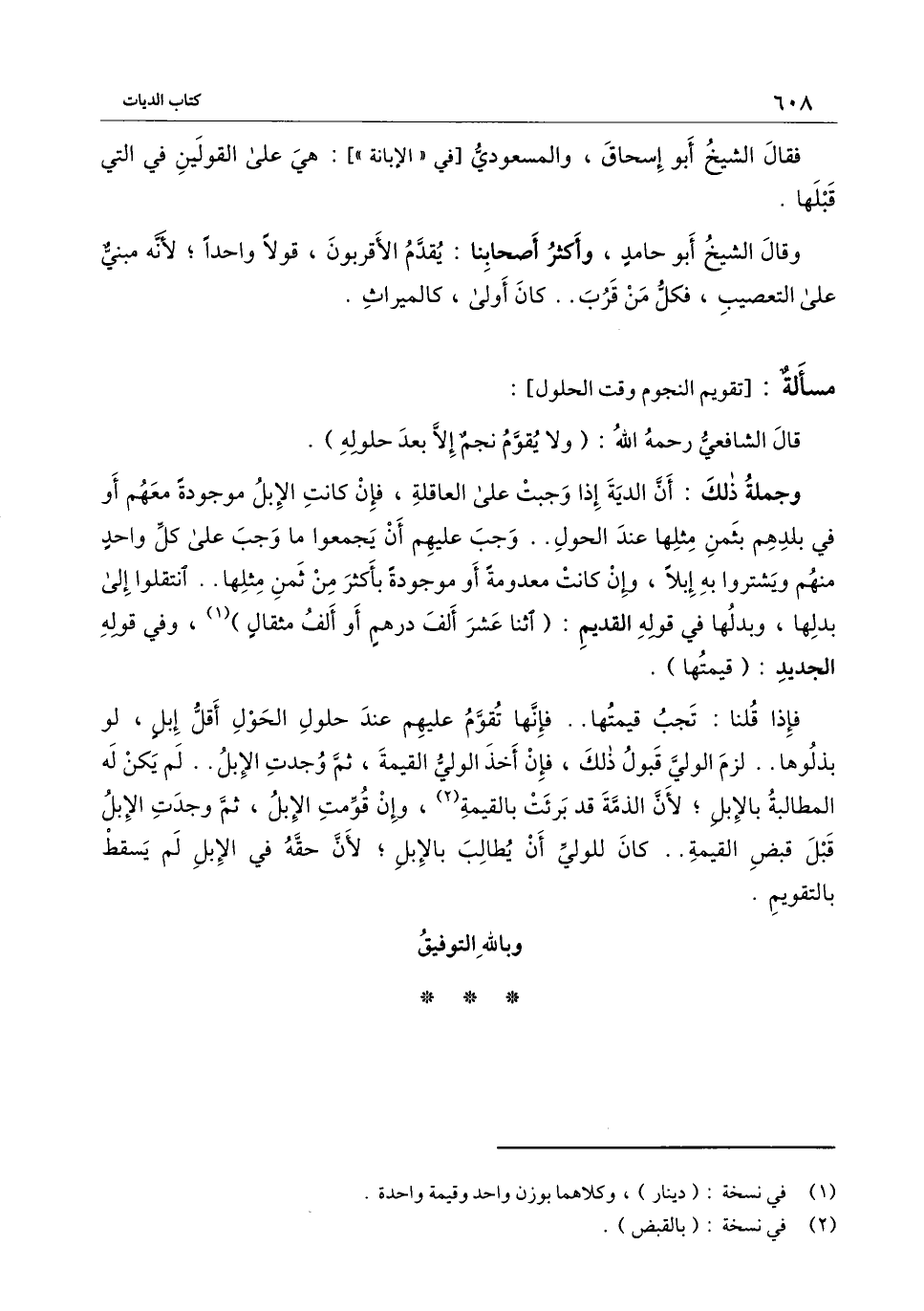 فإذا قلنا: تجب قيمتها.. فإنها تقوم عليهم عند حلول الحول أقل إبل، لو بذلوها.. لزم الولي قبول ذلك، فإن أخذ الولي القيمة، ثم وجدت الإبل.. لم يكن له المطالبة بالإبل؛ لأن الذمة قد برئت بالقيمة، وإن قومت الإبل، ثم وجدت الإبل قبل قبض القيمة.. كان للولي أن يطالب بالإبل؛ لأن حقه في الإبل لم يسقط بالتقويم.