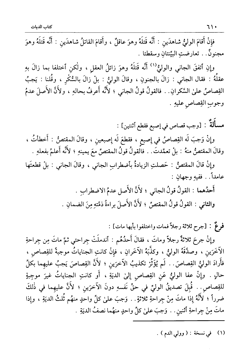 ] : وإن جرح ثلاثة رجلًا ومات، فقال أحدهم: اندملت جراحتي ثم مات من جراحة الآخرين، وصدقه الولي، وكذبه الآخران، فإن كانت الجنايات موجبة للقصاص، فأراد الولي القصاص.. لم يؤثر تكذيب الآخرين؛ لأن القصاص يجب عليهما بكل حال. وإن عفا الولي عن القصاص إلى الدية، أو كانت الجنايات غير موجبة للقصاص.. قبل تصديق الولي في حق نفسه دون الآخرين؛ لأن عليهما في ذلك ضررًا؛ لأنه إذا مات من جراحة ثلاثة.. وجب على كل واحد منهم ثلث الدية، وإذا مات من جراحة اثنين.. وجب على كل واحد منهما نصف الدية.