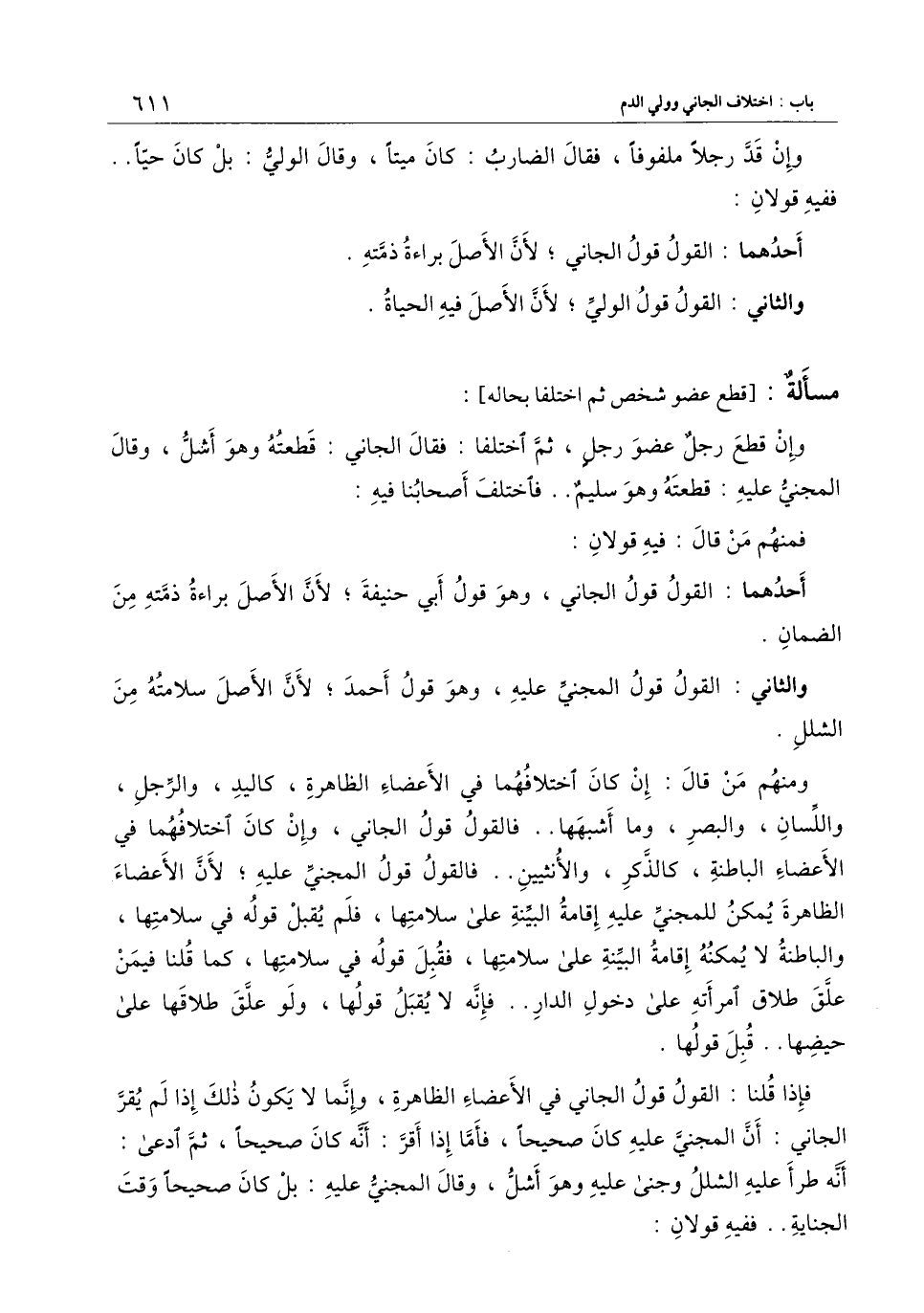 ومنهم من قال: إن كان اختلافهما في الأعضاء الظاهرة، كاليد، والرجل، واللسان، والبصر، وما أشبهها.. فالقول قول الجاني، وإن كان اختلافهما في الأعضاء الباطنة، كالذكر، والأنثيين.. فالقول قول المجني عليه؛ لأن الأعضاء الظاهرة يمكن للمجني عليه إقامة البينة على سلامتها، فلم يقبل قوله في سلامتها، والباطنة لا يمكنه إقامة البينة على سلامتها، فقبل قوله في سلامتها، كما قلنا فيمن علق طلاق امرأته على دخول الدار.. فإنه لا يقبل قولها، ولو علق طلاقها على حيضها.. قبل قولها.