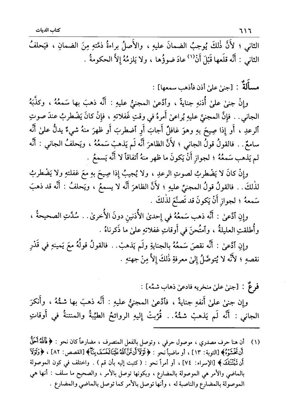 ] : وإن جنى على أذنه جناية، وادعى المجني عليه: أنه ذهب بها سمعه، وكذبه الجاني.. فإن المجني عليه يراعى أمره في وقت غفلاته، فإن كان يضطرب عند صوت الرعد، أو إذا صيح به وهو غافل أجاب أو اضطرب أو ظهر منه شيء يدل على أنه سامع.. فالقول قول الجاني؛ لأن الظاهر أنه لم يذهب سمعه، ويحلف الجاني: أنه لم يذهب سمعه؛ لجواز أن يكون ما ظهر منه اتفاقًا لا أنه يسمع.