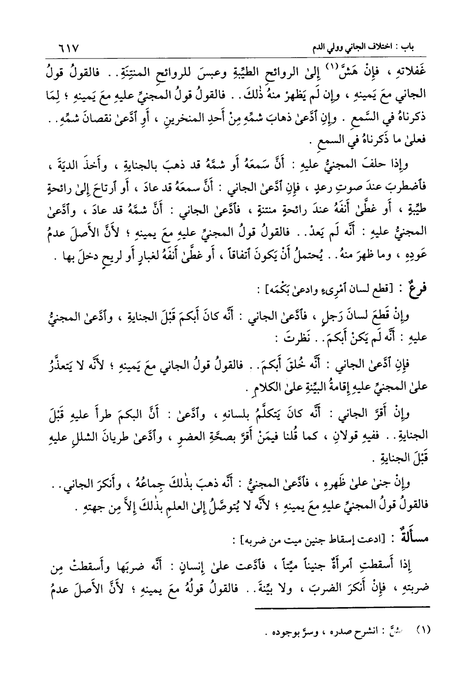 غفلاته، فإن هش إلى الروائح الطيبة وعبس للروائح المنتنة.. فالقول قول الجاني مع يمينه، وإن لم يظهر منه ذلك.. فالقول قول المجني عليه مع يمينه؛ لما ذكرناه في السمع. وإن ادعى ذهاب شمه من أحد المنخرين، أو ادعى نقصان شمه.. فعلى ما ذكرناه في السمع.