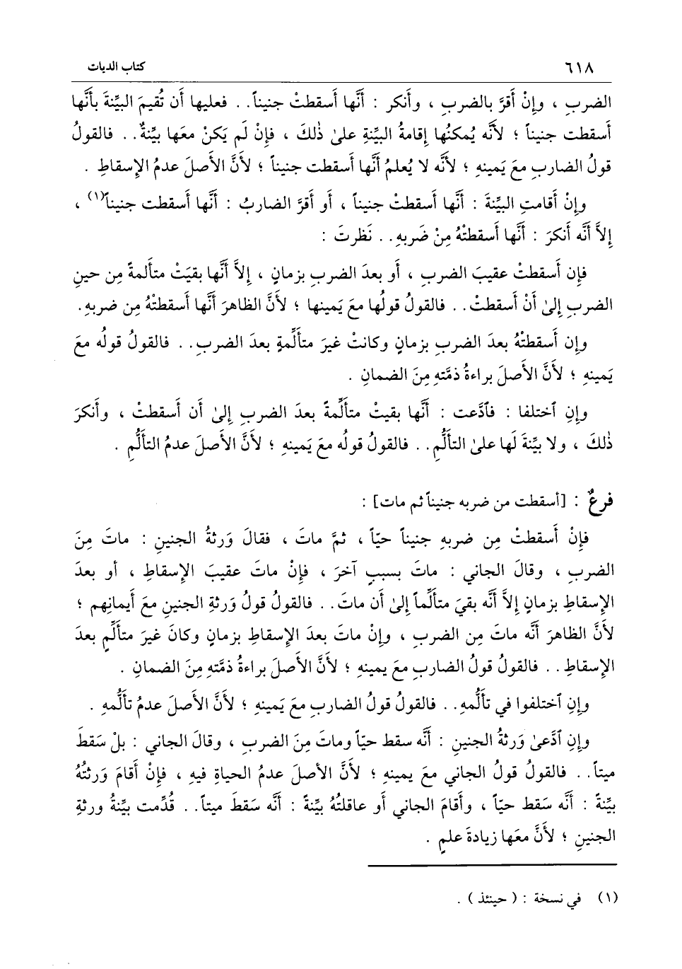 الضرب، وإن أقر بالضرب، وأنكر: أنها أسقطت جنينًا.. فعليها أن تقيم البينة بأنها أسقطت جنينًا؛ لأنه يمكنها إقامة البينة على ذلك، فإن لم يكن معها بينة.. فالقول قول الضارب مع يمينه؛ لأنه لا يعلم أنها أسقطت جنينًا؛ لأن الأصل عدم الإسقاط.