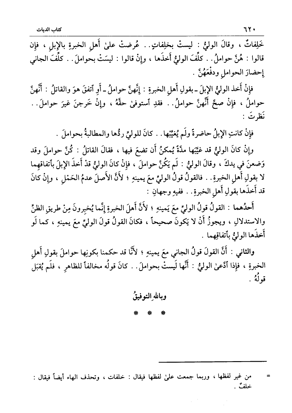 خلفات، وقال الولي: ليست بخلفات.. عرضت على أهل الخبرة بالإبل، فإن قالوا: هن حوامل.. كلف الولي أخذها، وإن قالوا: ليست بحوامل.. كلف الجاني إحضار الحوامل ودفعهن.