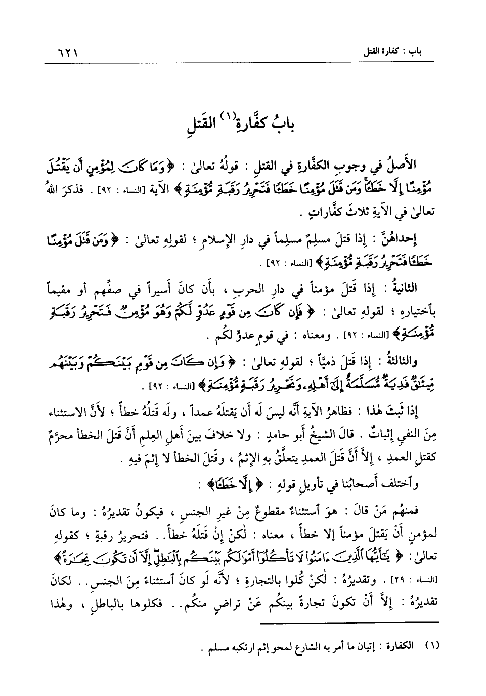 إحداهن: إذا قتل مسلم مسلمًا في دار الإسلام؛ لِقَوْلِهِ تَعَالَى: {وَمَنْ قَتَلَ مُؤْمِنًا خَطَأً فَتَحْرِيرُ رَقَبَةٍ مُؤْمِنَةٍ} [النساء: 92] [النساء: 92] .