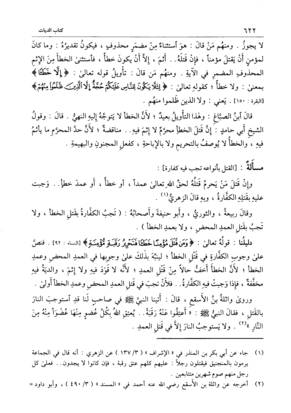 «وروى واثلة بن الأسقع، قال: أتينا النبي - صَلَّى اللَّهُ عَلَيْهِ وَسَلَّمَ - في صاحب لنا قد استوجب النار بالقتل، فقال النبي - صَلَّى اللَّهُ عَلَيْهِ وَسَلَّمَ -: " أعتقوا عنه رقبة.. يعتق الله بكل عضو منها عضوًا منه من النار» . ولا يستوجب النار إلا في قتل العمد.