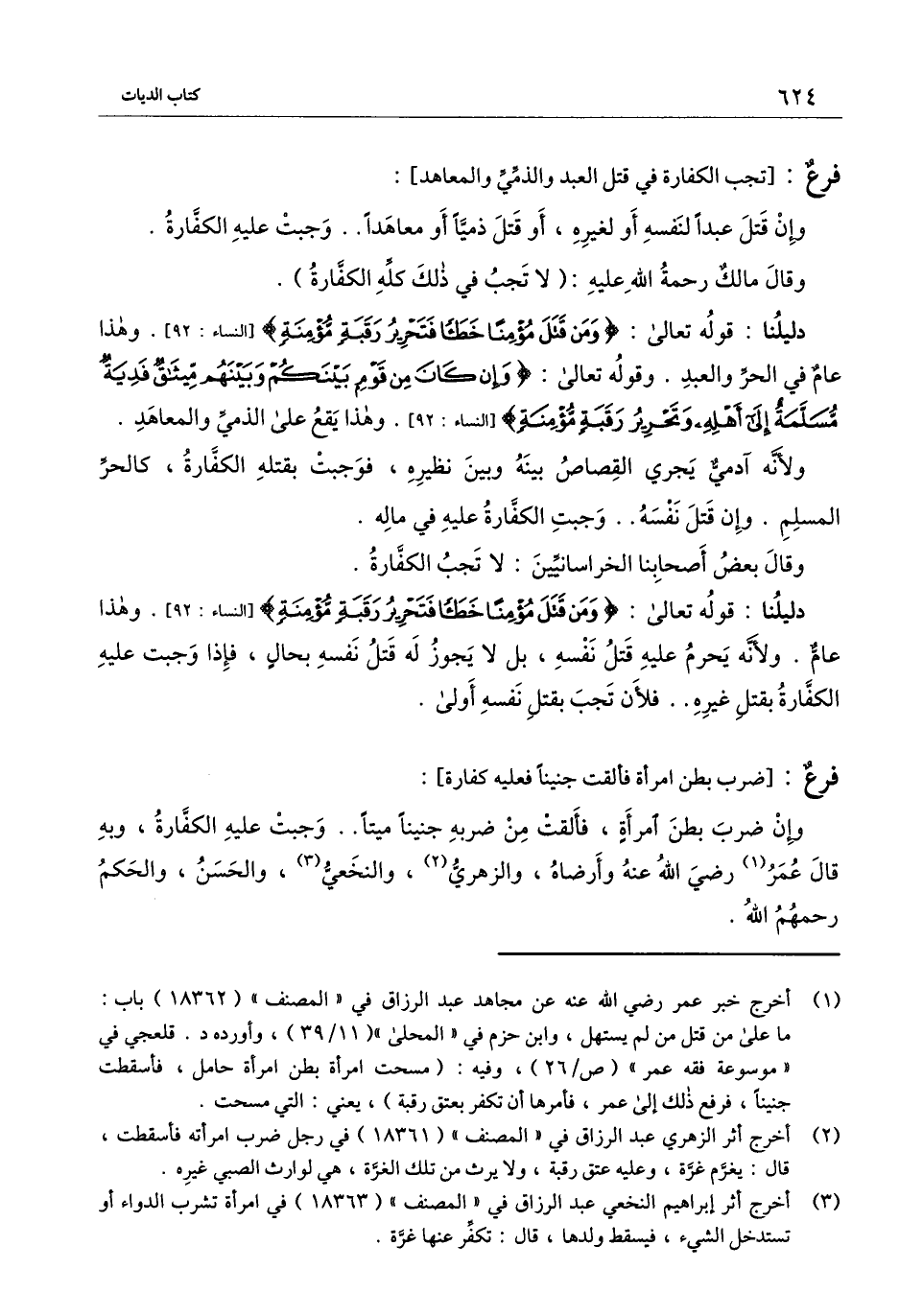 ] : وإن ضرب بطن امرأة، فألقت من ضربه جنينًا ميتًا.. وجبت عليه الكفارة، وبه قال عمر - رَضِيَ اللَّهُ عَنْهُ - وأرضاه، والزهري، والنخعي، والحسن، والحكم - رَحِمَهُمُ اللَّهُ -.