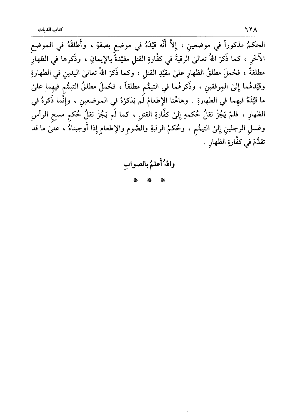الحكم مذكورًا في موضعين، إلا أنه قيده في موضع بصفة، وأطلقه في الموضع الآخر، كما ذكر الله تعالى الرقبة في كفارة القتل مقيدة بالإيمان، وذكرها في الظهار مطلقة، فحمل مطلق الظهار على مقيد القتل، وكما ذكر الله تعالى اليدين في الطهارة وقيدهما إلى المرفقين، وذكرهما في التيمم مطلقًا، فحمل مطلق التيمم فيهما على ما قيده فيهما في الطهارة. وهاهنا الإطعام لم يذكره في الموضعين، وإنما ذكره في الظهار، فلم يجز نقل حكمه إلى كفارة القتل، كما لم يجز نقل حكم مسح الرأس وغسل الرجلين إلى التيمم، وحكم الرقبة والصوم والإطعام إذا أوجبناه، على ما قد تقدم في كفارة الظهار.
