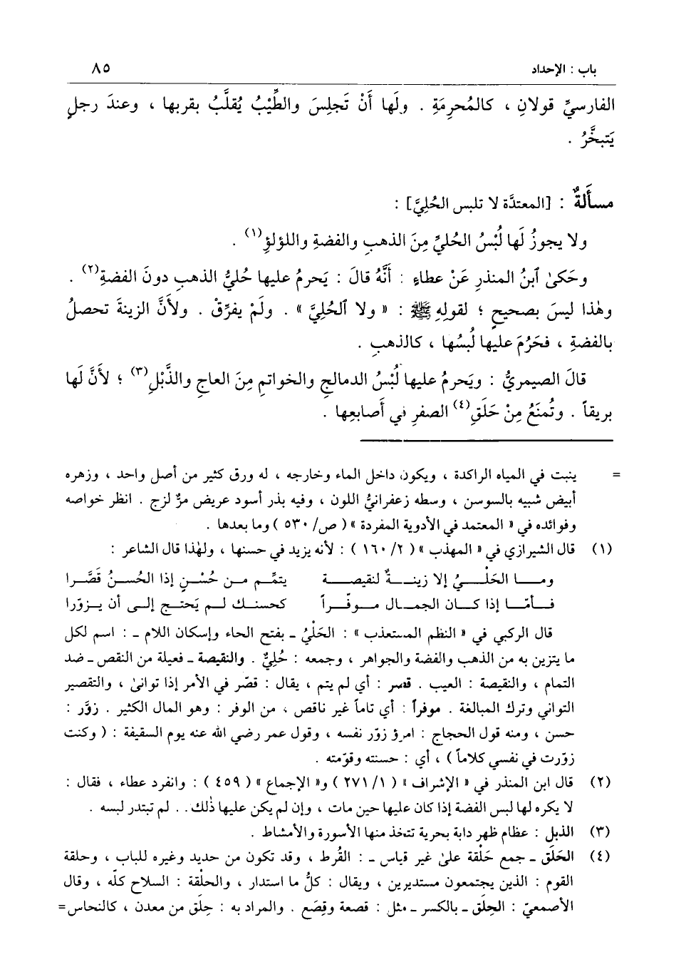 وحكى ابن المنذر عن عطاء: أنه قال: يحرم عليها حلي الذهب دون الفضة. وهذا ليس بصحيح؛ لقوله- صَلَّى اللَّهُ عَلَيْهِ وَسَلَّمَ -: «ولا الحلي» . ولم يفرق. ولأن الزينة تحصل بالفضة، فحرم عليها لبسها، كالذهب.