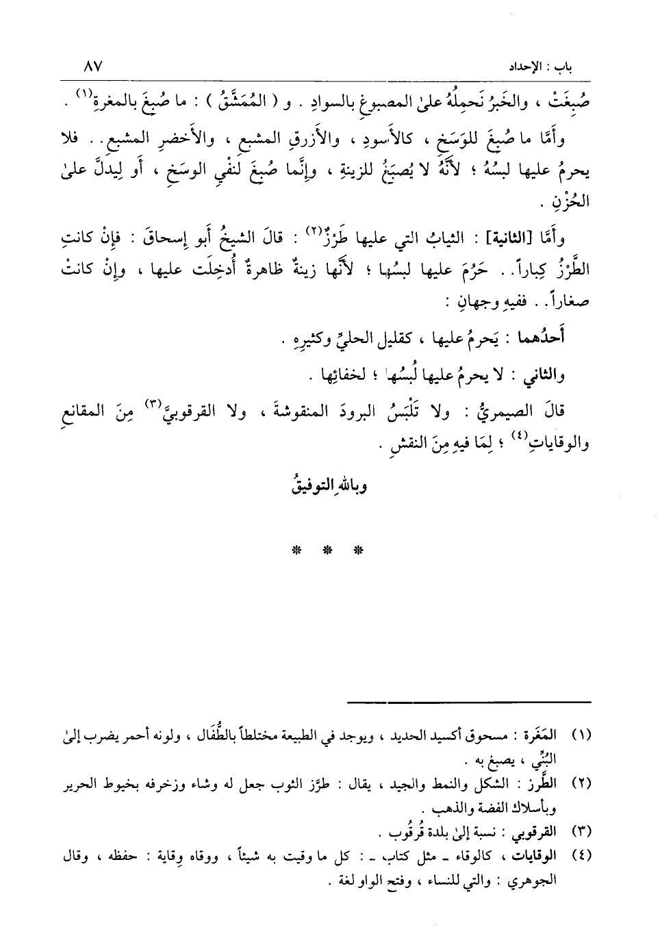 قال الصيمري: ولا تلبس البرود المنقوشة، ولا القرقوبي من المقانع والوقايات؛ لما فيه من النقش.