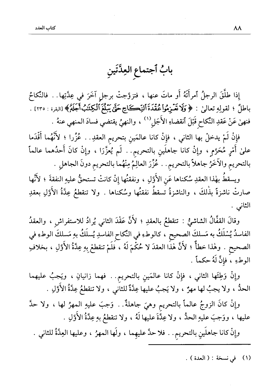 إذا طلق الرجل امرأته أو مات عنها، فتزوجت برجل آخر في عدتها.. فالنكاح باطل؛ لِقَوْلِهِ تَعَالَى: {وَلا تَعْزِمُوا عُقْدَةَ النِّكَاحِ حَتَّى يَبْلُغَ الْكِتَابُ أَجَلَهُ} [البقرة: 235] [البقرة: 235] . فنهى عن عقد النكاح قبل انقضاء الأجل، والنهي يقتضي فساد المنهي عنه.