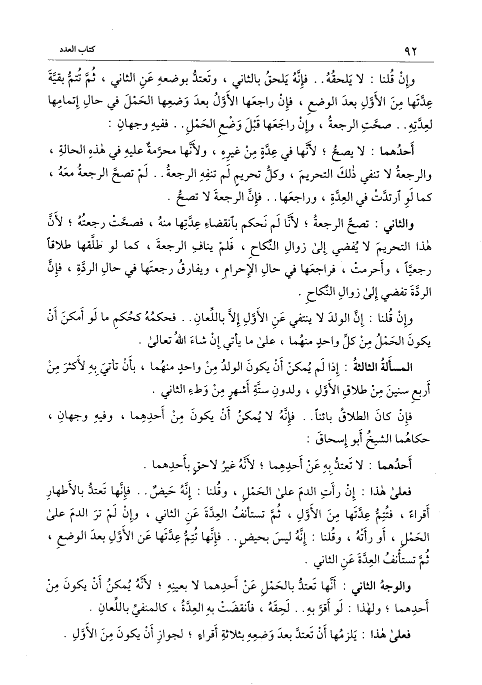 وإن قلنا: لا يحلقه.. فإنه يلحق بالثاني، وتعتد بوضعه عن الثاني، ثم تتم بقية عدتها من الأول بعد الوضع، فإن راجعها الأول بعد وضعها الحمل في حال إتمامها لعدته.. صحت الرجعة، وإن راجعها قبل وضع الحمل.. ففيه وجهان: