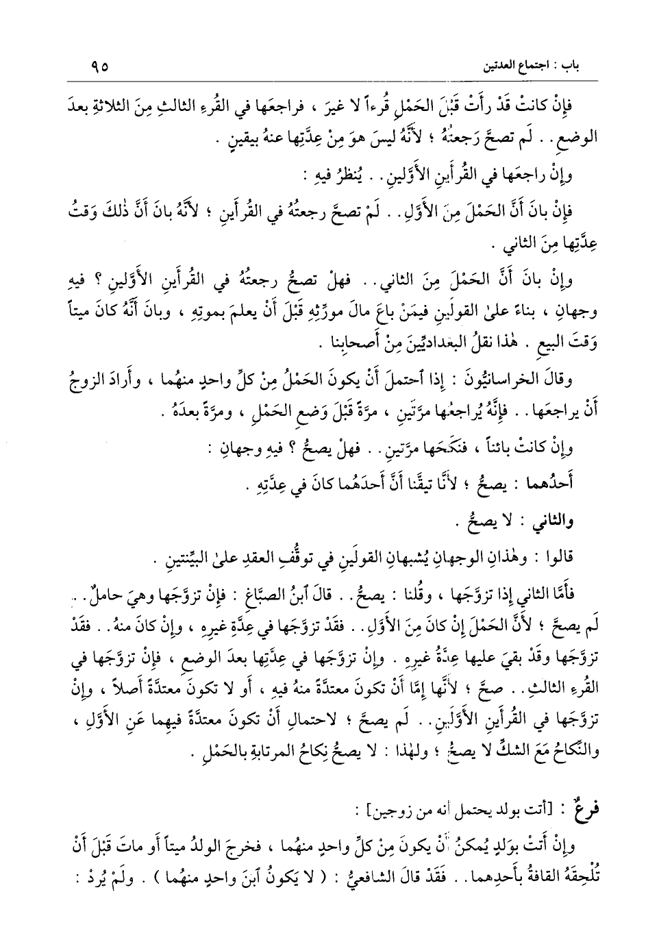 وإن بان أن الحمل من الثاني.. فهل تصح رجعته في القرأين الأولين؟ فيه وجهان، بناء على القولين فيمن باع مال مورثه قبل أن يعلم بموته، وبان أنه كان ميتا وقت البيع. هذا نقل البغداديين من أصحابنا.