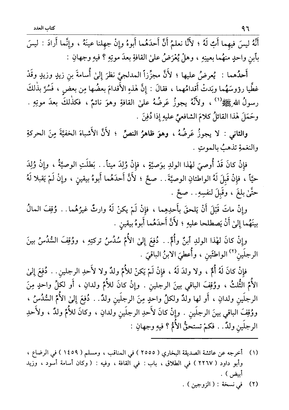 فإن كان له أم، ولا ولد له، فإن لم يكن للأم ولد ولا لأحد الرجلين.. دفع إلى الأم الثلث، ووقف الباقي بين الرجلين. وإن كان للأم ولدان، أو لكل واحد من الرجلين ولدان، أو لها ولد ولكل واحد من الرجلين ولد.. دفع إلى الأم السدس، ووقف الباقي بين الرجلين. وإن كان لأحد الرجلين ولدان، وكان للأم ولد، ولأحد الرجلين ولد.. فكم تستحق الأم؟ فيه وجهان: