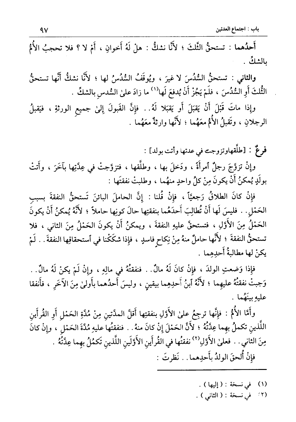 وأما الأم: فإنها ترجع على الأول بنفقتها أقل المدتين من مدة الحمل أو القرأين اللذين تكمل بهما عدته؛ لأن الحمل إن كان منه.. فنفقتها عليه مدة الحمل، وإن كان من الثاني.. فعلى الأول نفقتها في القرأين الأولين اللذين تكمل بهما عدته.