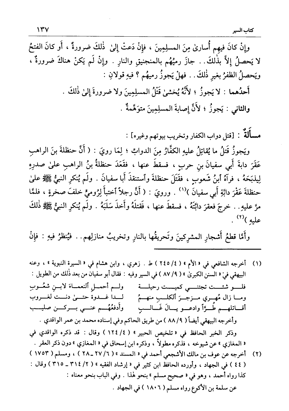 ويجوز قتل ما يقاتل عليه الكفار من الدواب؛ لما روي: «أن حنظلة بن الراهب عقر دابة أبي سفيان بن حرب، فسقط عنها، فقعد حنظلة بن الراهب على صدره ليذبحه، فرآه ابن شعوب، فقتل حنظلة واستنقذ أبا سفيان، ولم ينكر النَّبيّ - صَلَّى اللَّهُ عَلَيْهِ وَسَلَّمَ -، على حنظلة عقر دابة أبي سفيان» وروي: «أن رجلًا اختبأ لرومي خلف صخرة، فلما مر عليه.. خرج فعقر دابته، فسقط عنها، فقتله وأخذ سلبه. ولم ينكر النَّبيّ - صَلَّى اللَّهُ عَلَيْهِ وَسَلَّمَ -، ذلك عليه» .