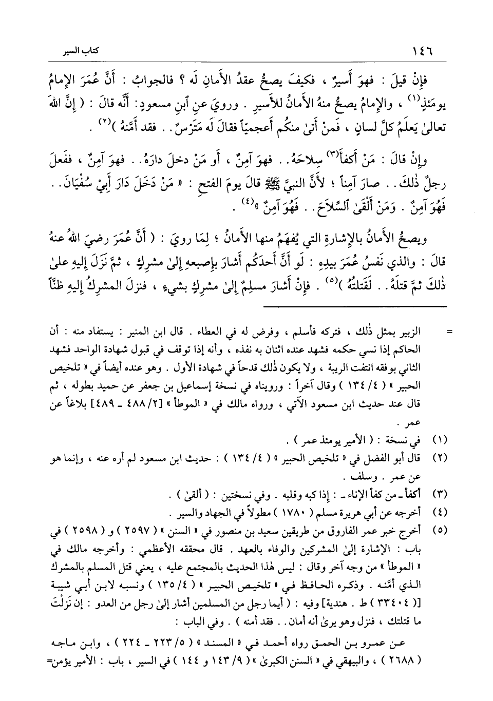 فإن قيل: فهو أسير، فكيف يصح عقد الأمان له؟ فالجواب: أن عمر الإمام يومئذ، والإمام يصح منه الأمان للأسير. ورُوِي عن ابن مَسعُودٍ: أنه قال: (إن الله تَعالَى يعلم كل لسان، فمن أتى منكم أعجميًا فقال له مترس.. فقد أمنه) .
