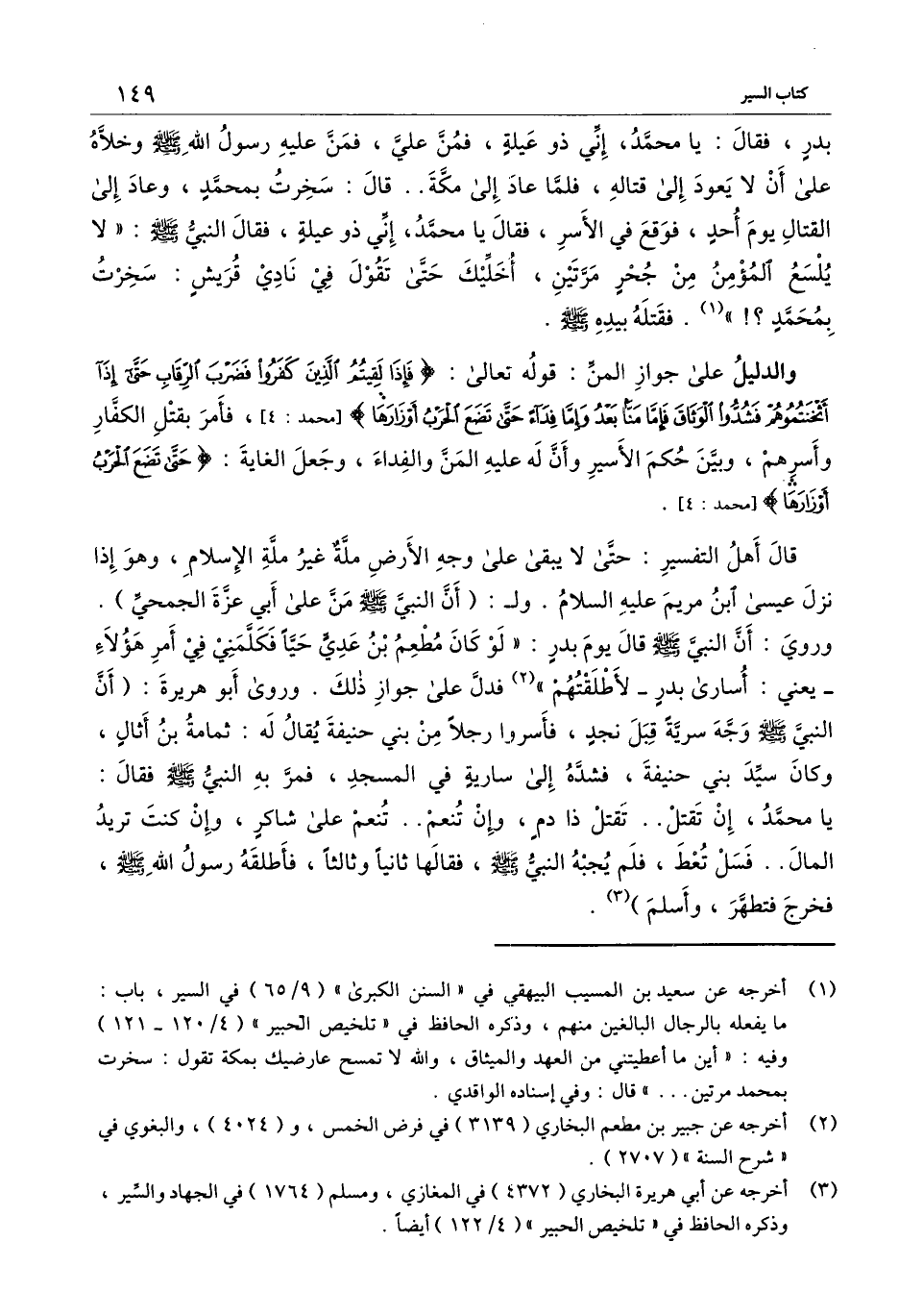 قال أهل التفسير: حتى لا يبقى على وجه الأرض ملة غير ملة الإسلام، وهو إذا نزل عيسى ابن مريم - عَلَيْهِ السَّلَامُ -. ولـ: (أن النَّبيّ - صَلَّى اللَّهُ عَلَيْهِ وَسَلَّمَ - من على أبي عزة الجمحي) . ورُوِي: أن النَّبيّ - صَلَّى اللَّهُ عَلَيْهِ وَسَلَّمَ - قال يوم بدر: «لو كان مطعم بن عدي حيًا فكلمني في أمر هؤلاء ـ يعني: أسارى بدر ـ لأطلقتهم» فدلَّ على جواز ذلك. ورُوِى أبُو هُرَيرَة: «أن النَّبيّ - صَلَّى اللَّهُ عَلَيْهِ وَسَلَّمَ -. وجه سرية قبل نجد، فأسروا رجلًا من بني حَنِيفَة يقال له: ثمامة بن أثال، وكان سيد بني حَنِيفَة، فشده إلى سارية في المسجد، فمر به النَّبيّ - صَلَّى اللَّهُ عَلَيْهِ وَسَلَّمَ -، فقال: يا محمد، إن تقتل.. تقتل ذا دم، وإن تنعم.. تنعم على شاكر، وإن كنت تريد المال.. فسل تعط، فلم يجبه النَّبيّ - صَلَّى اللَّهُ عَلَيْهِ وَسَلَّمَ -. فقالها ثانيًا وثالثًا، فأطلقه رسول الله - صَلَّى اللَّهُ عَلَيْهِ وَسَلَّمَ -. فخرج فتطهر وأسلم» .