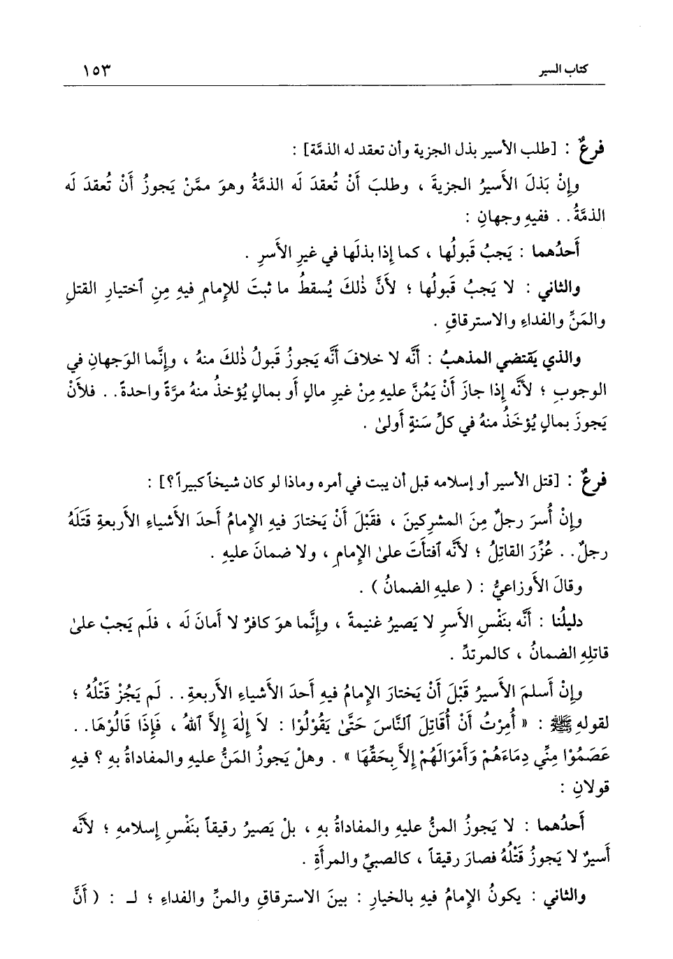 ] : وإن أسر رجل من المشركين، فقبل أن يختار فيه الإمام أحد الأشياء الأربعة قتله رجل.. عزر القاتل؛ لأنه افتأت على الإمام، ولا ضمان عليه.