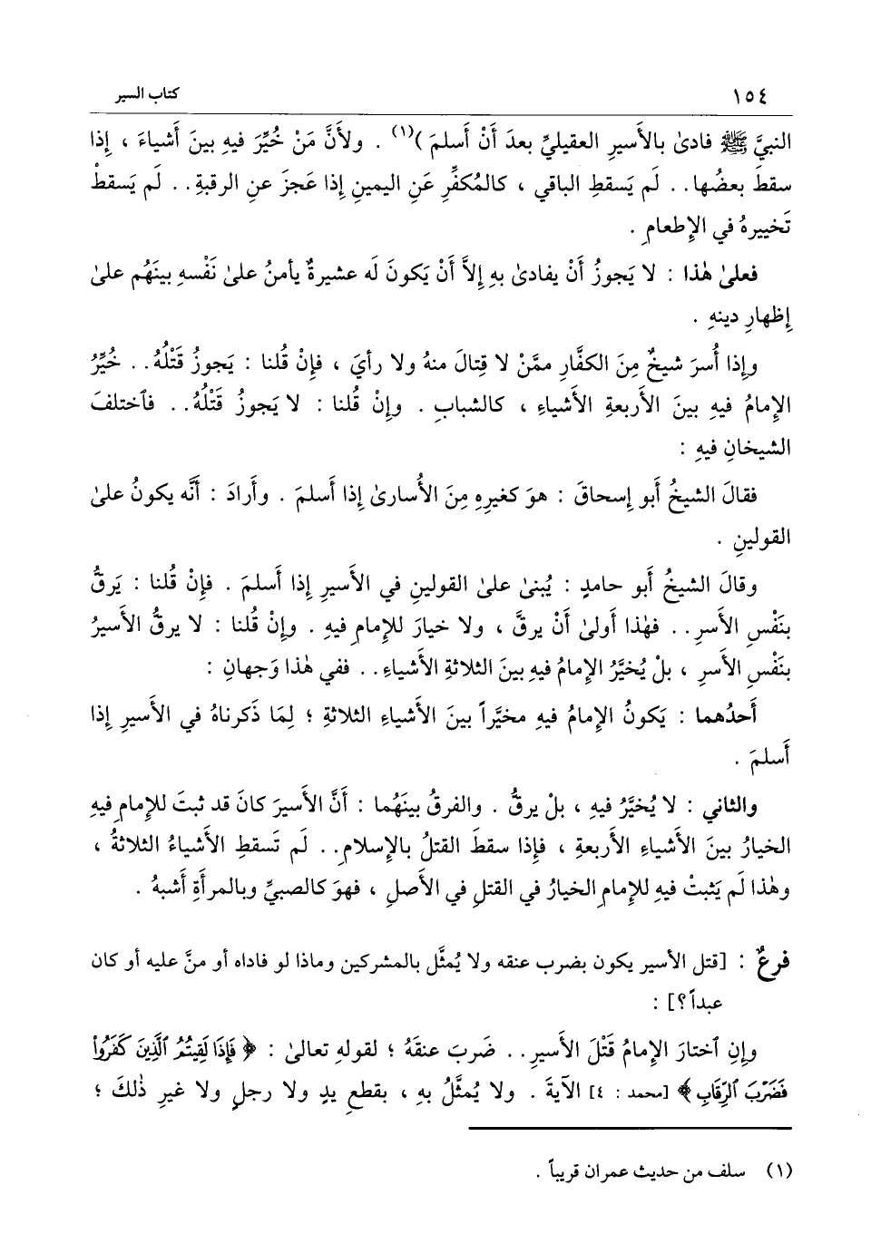 والثاني: لا يخير فيه، بل يرق. والفرق بينهما: أن الأسير كان قد ثبت للإمام فيه الخيار بين الأشياء الأربعة، فإذا سقط القتل بالإسلام.. لم تسقط الأشياء الثلاثة، وهذا لم يثبت فيه للإمام الخيار في القتل في الأصل، فهو كالصبي وبالمرأة أشبه.