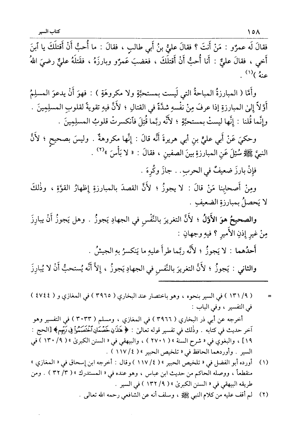 وحكي عن أبي عليّ بن أبي هُرَيرَة أنه قال: إنها مكروهة. وليس بصحيح؛ لأن «النَّبيّ - صَلَّى اللَّهُ عَلَيْهِ وَسَلَّمَ - سئل عن المبارزة بين الصفين، فقال: "لا بأس» .